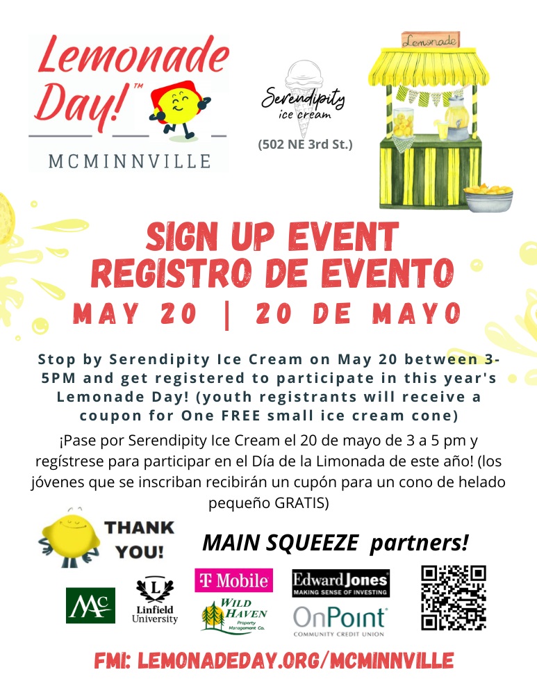 Program organizers are continually working with Yamhill County Health officials to ensure participants are provided information on State and County health mandated guidelines for food service and other health mandates. The safety of our community and its citizens is taken very seriously and is important to us. We are extremely sensitive to the fact that everything regarding Lemonade Day must factor in health and safety protocols that include social distancing and sanitation.