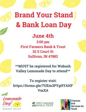 Participating children will need to complete a business plan for their Lemonade stand prior to Bank Loan Day. On June 4th First Farmers Bank & Trust employees are volunteering to teach children about bank loans, give a tour of the bank and walk the children through their loan application. Loan forms will be provided at the event and the process of applying for a loan will be explained by a loan officer. On Loan Day children will share their business plan with Lemonade Day Staff & First Farmers Bank & Trust employee volunteers.